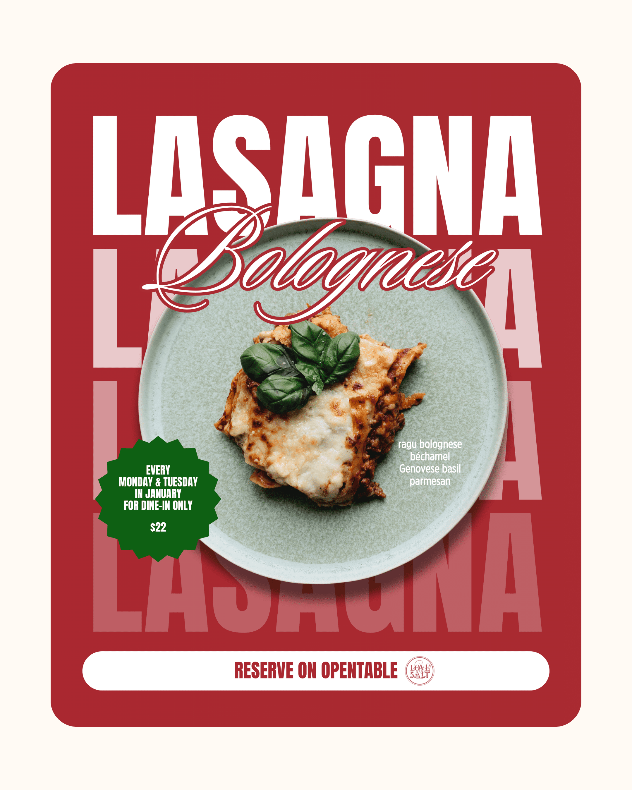 ragu bolognese, bechamel, Genovese basil, parmesan